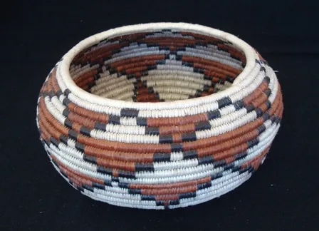 CESTERÍA SERI: CANASTAS Y CORITASLa cestería seri es tan laboriosa en su ejecución y tan bella en sus diseños que puede considerarse una de las mejores del mundo en su género. La materia prima es la madera de un arbusto considerado sagrado para ellos: el Torote prieto (Jatropha cuneata), llamado Haat en lengua comca’ac. Se elabora por las mujeres del grupo, que buscan las ramas, las tuestan al fuego para eliminar la corteza y ayudándose de sus dientes van rasgando tiras de diferentes grosores, dependiendo del diseño, tamaño y complejidad del tejido; agrupan las tiras en pequeños bultos y las tiñen con productos vegetales: para el color negro utilizan la corteza del árbol del mezquite, para el marrón o café la raíz del cosahui o heepol, machacada y cocida y para el color amarillo la flor de somete. Después de teñidas se remojan en agua de mar para hacerlas más flexibles, reafirmar su color y protegerlas de termitas o algún otro animal. La artesana seri procura tejer de madrugada y un lugar sombreado para que no se pierda la humedad de la fibra. Con un hueso de venado en forma de punzón y la habilidad de sus manos comienza con un nido en forma de cruz (coafliz) y lo continúa en forma de espiral, entreverando las tiras de color natural con las de color café, negro o amarillo, según el diseño geométrico o figurativo que ya ha creado previamente en su mente: zig-zag, mariposas, venado, flores estilizadas, etc. Para una persona que no conoce el trabajo y grado de dificultad que existe detrás de una corita (en forma de plato) o de una canasta (en forma de olla) de origen seri, el precio de su venta quizás le parezca alto. Pero una cestería de este tipo, de madera tejida, es de un alto valor en el mercado por la calidad de su tejido, la belleza de su diseño y la dificultad en su elaboración. Es un objeto de arte vivo que manifiesta la fuerza, la magia y la fuerte energía del desierto de Sonora.