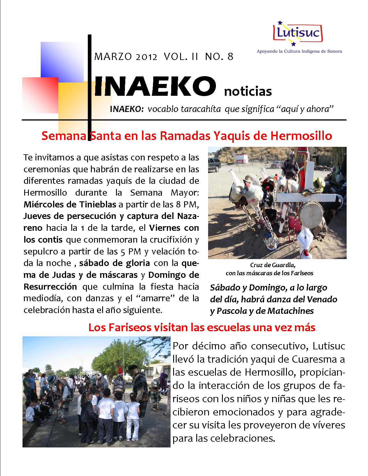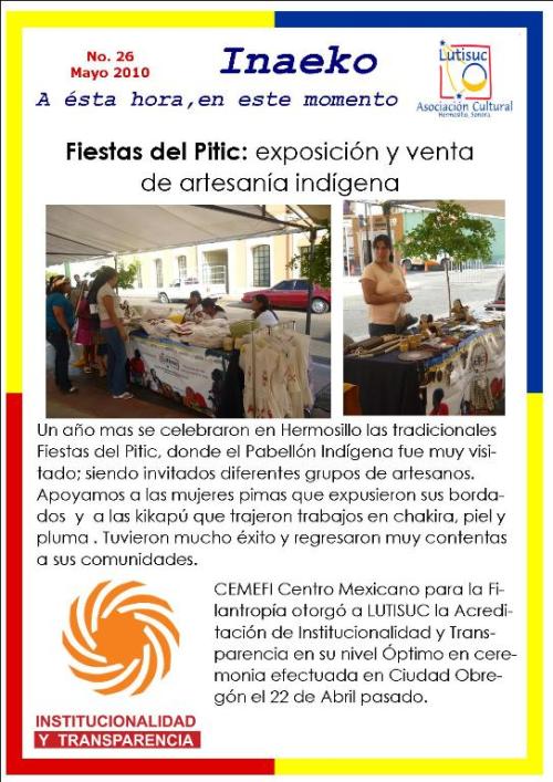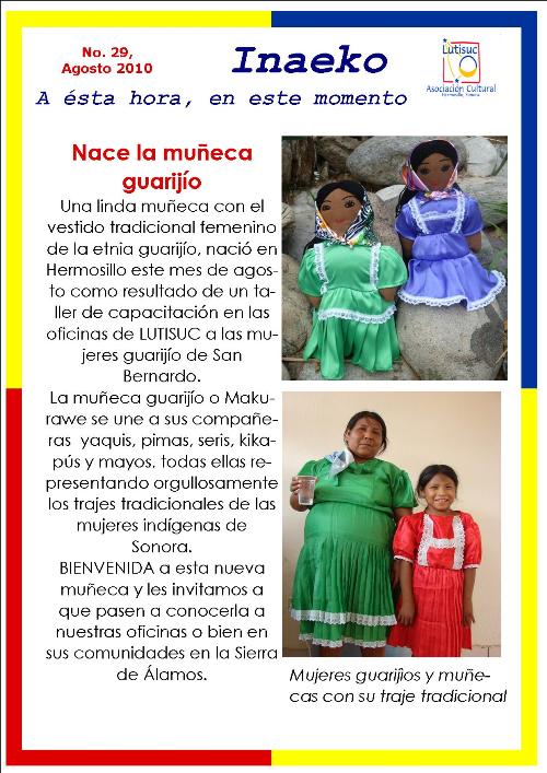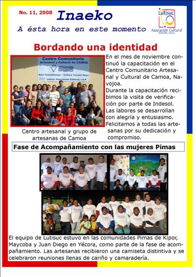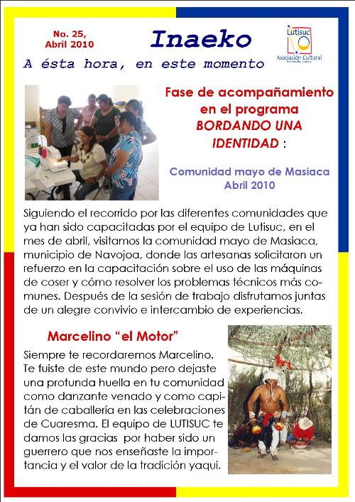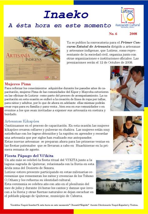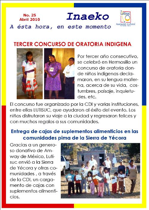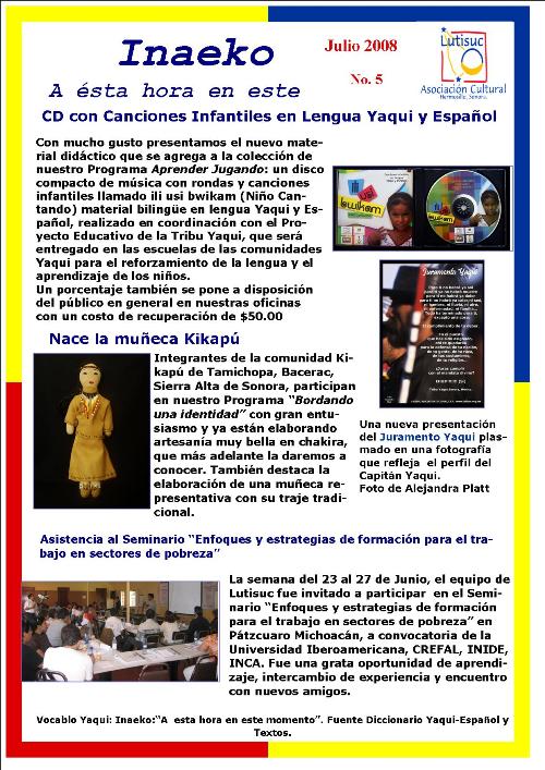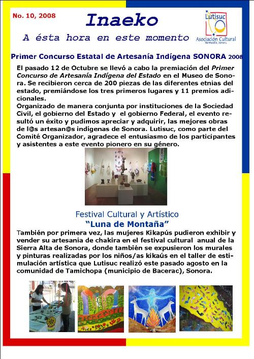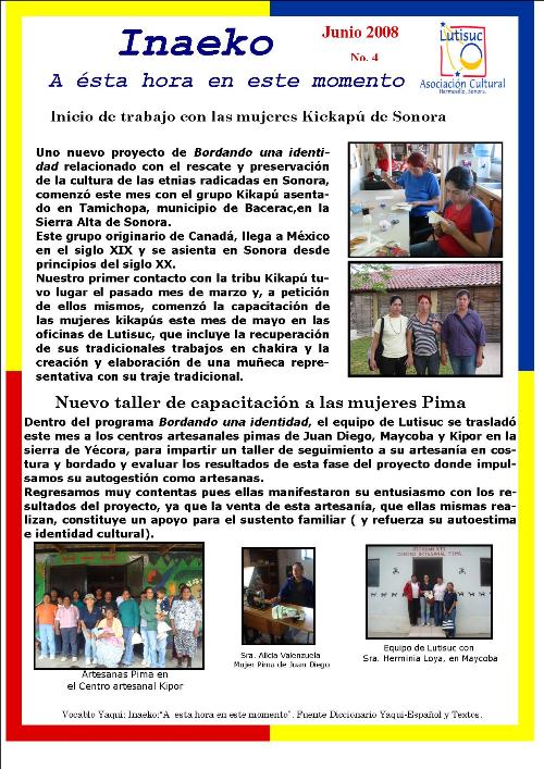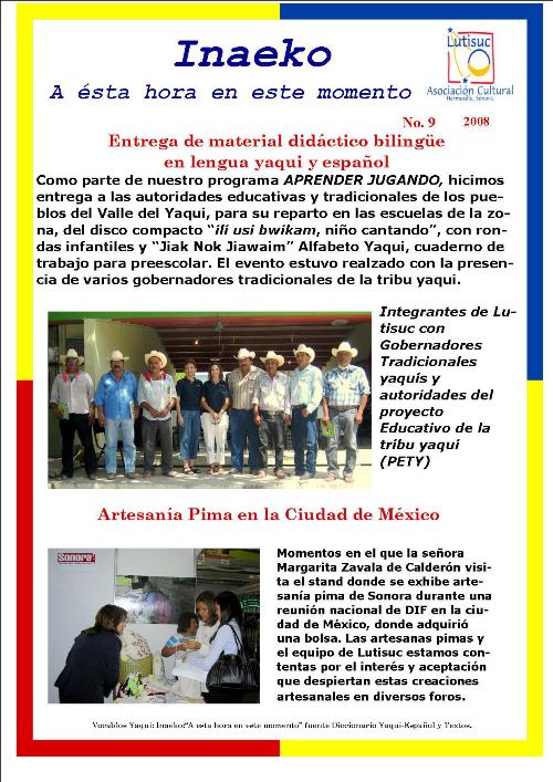 Inaeko “A ésta Hora y en este momento”Con el objeto de dar a conocer periódicamente nuestras actividades, enviamos mensualmente un pequeño boletín al que denominamos con la palabra yaqui Inaeko, que quiere decir “ a esta hora y en este momento” aludiendo a nuestro trabajo más reciente en ese momento. Estos son los boletines enviados desde el primer número en marzo de 2008. |