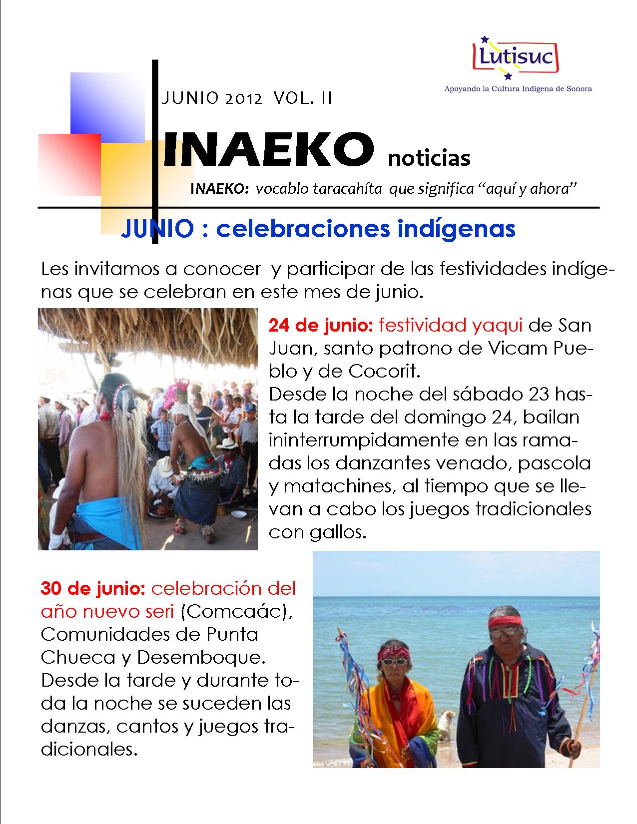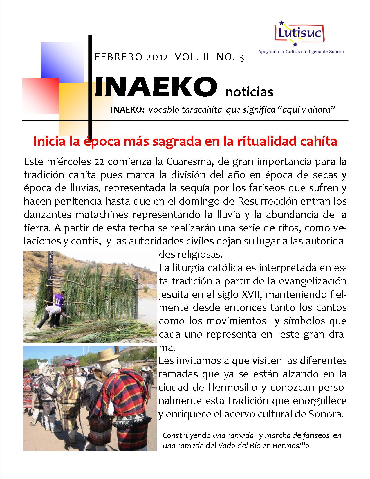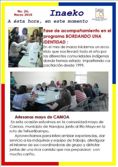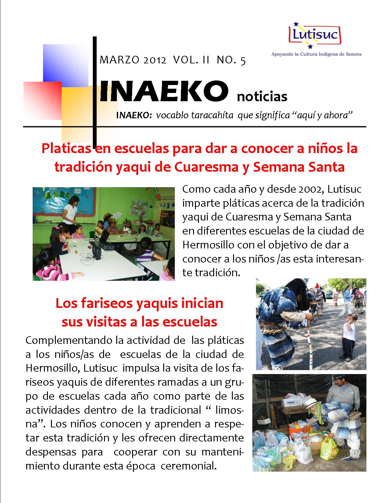 Inaeko “A ésta Hora y en este momento”Con el objeto de dar a conocer periódicamente nuestras actividades, enviamos mensualmente un pequeño boletín al que denominamos con la palabra yaqui Inaeko, que quiere decir “ a esta hora y en este momento” aludiendo a nuestro trabajo más reciente en ese momento. Estos son los boletines enviados desde el primer número en marzo de 2008. |