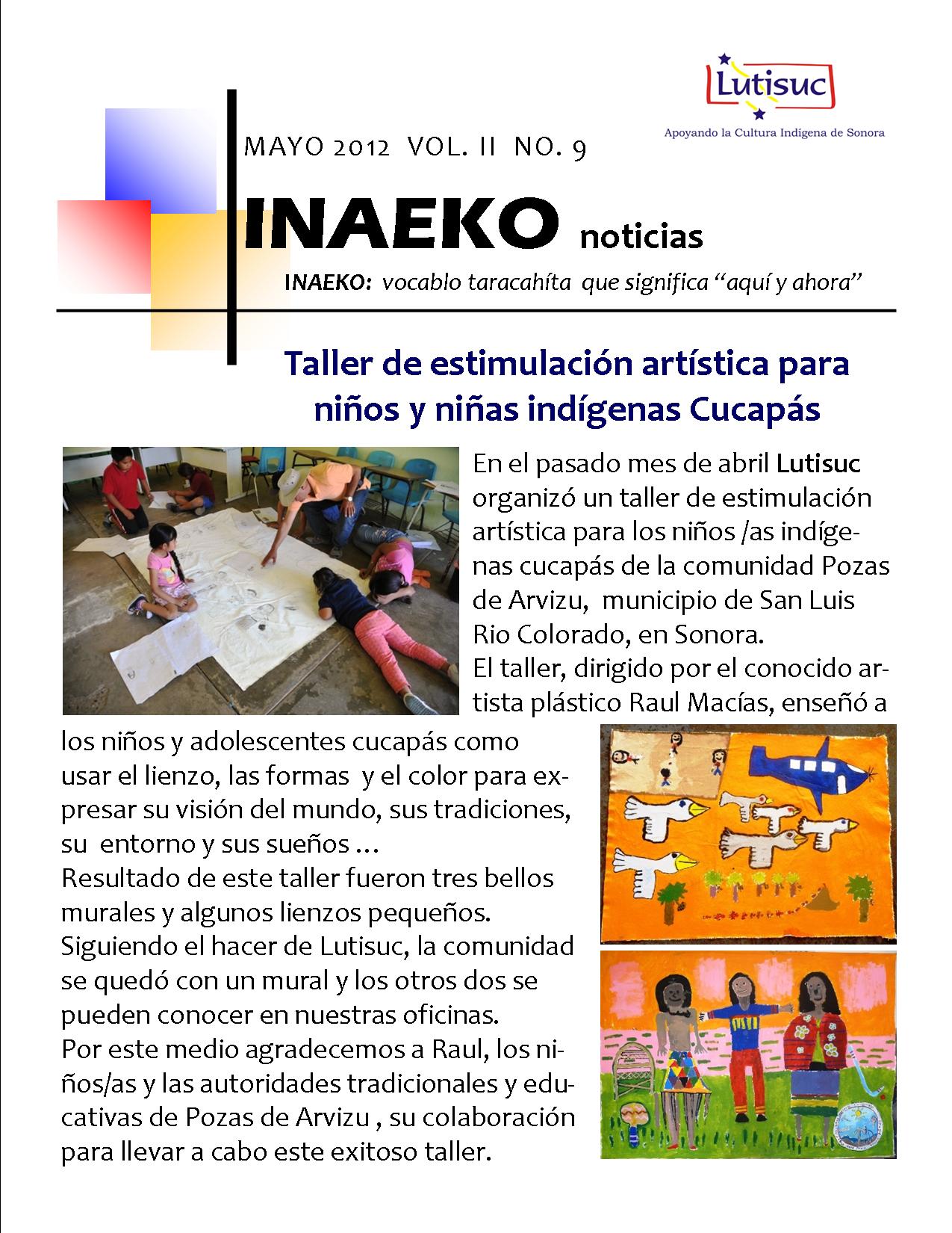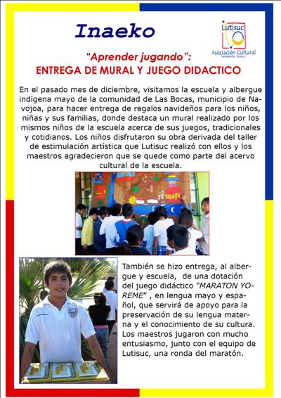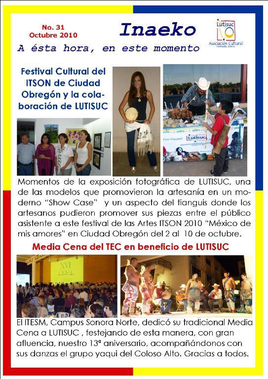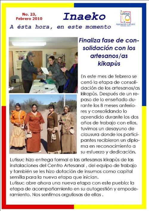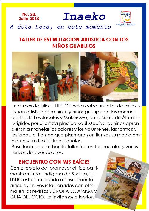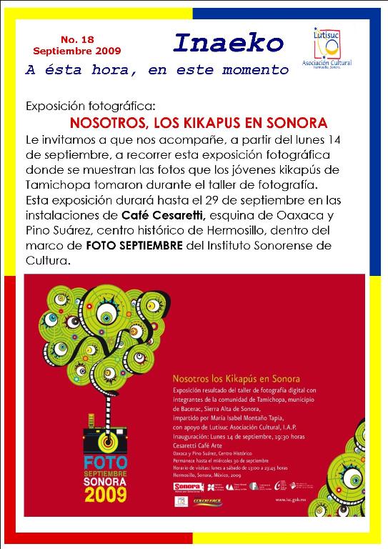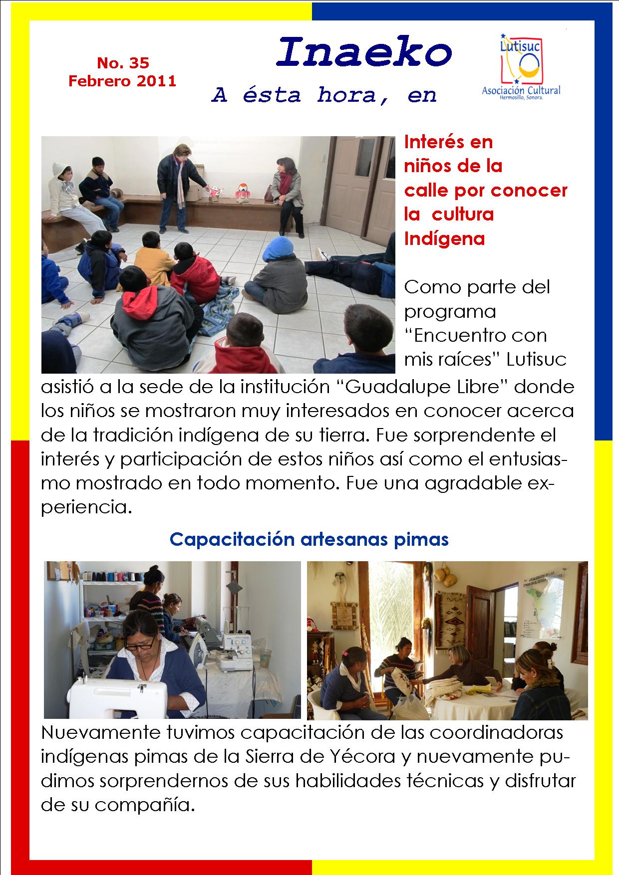 Inaeko “A ésta Hora y en este momento”Con el objeto de dar a conocer periódicamente nuestras actividades, enviamos mensualmente un pequeño boletín al que denominamos con la palabra yaqui Inaeko, que quiere decir “ a esta hora y en este momento” aludiendo a nuestro trabajo más reciente en ese momento. Estos son los boletines enviados desde el primer número en marzo de 2008. |