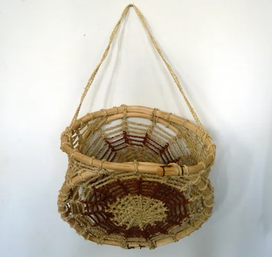 Su artesanía está en estrecho contacto con los elementos naturales del paisaje que les rodea y con sus actividades cotidianas. En su cestería, además de los guaris o huaris realizados con hojas de palma y palmilla, elaboran unas cestas tejidas con fibra o hilos de ixtle de maguey torcidos o trenzados (lo que conocemos como “mecate”) o bien con finas tiras de cuero animal curtido. Son las angarillas: cestos hechos con tres aros de madera procedente de un árbol de ramas flexibles como el álamo o sauce, unidos con una red tejida, a modo de tela de araña, de manera que forman una canasta, con un mecate más largo en uno de sus lados para poderla sostener con la cabeza ya que éste atraviesa la frente en forma transversal. De este modo hombres y mujeres guarijío pueden cargar objetos colgados sobre la espalda mientras cuentan con las manos libres para realizar otra acción o transportar otra carga. Los realizan en diversos tamaños y también los cuelgan de las paredes.