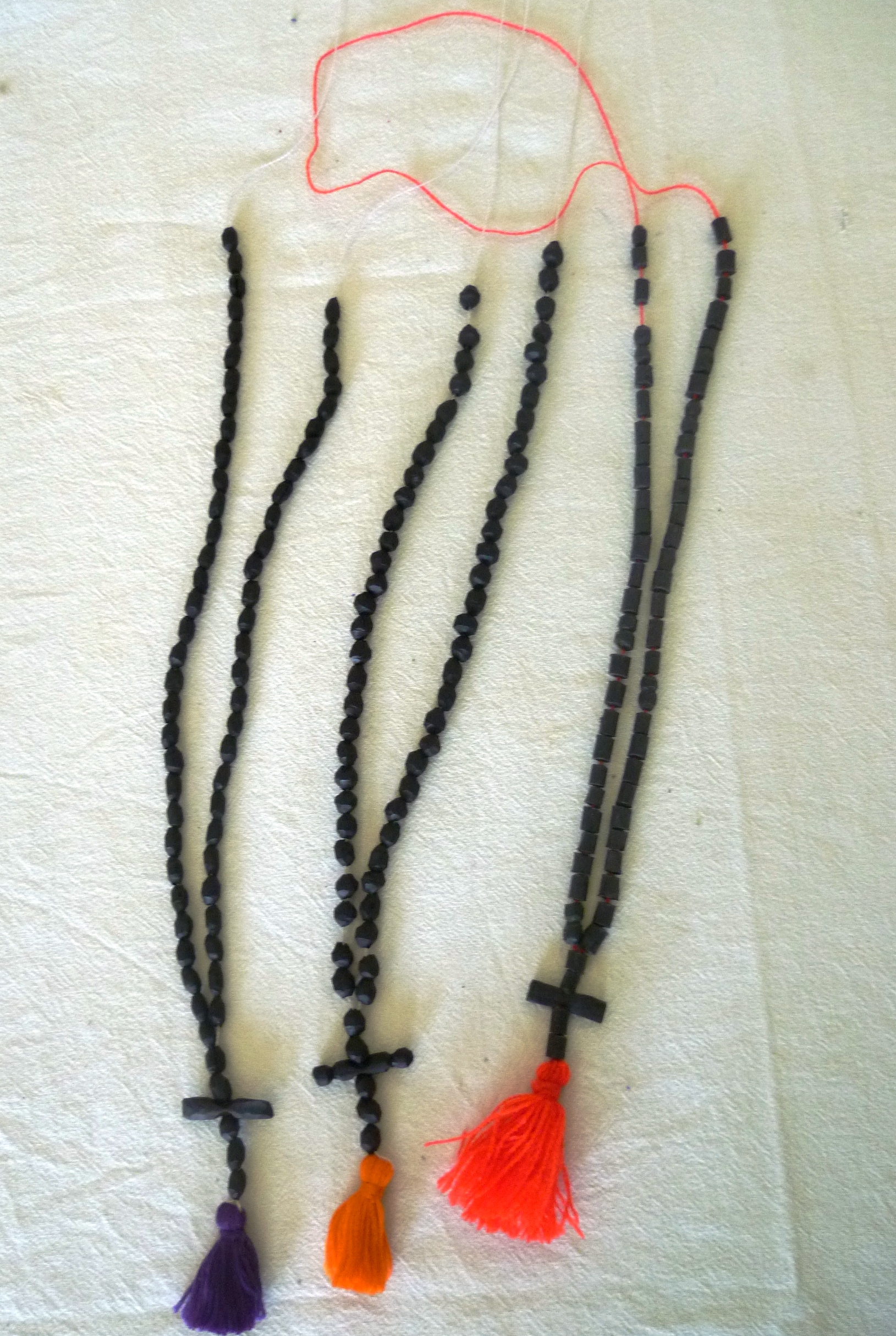 Las cuentas del rosario los artesanos las labran a mano una por una, excepto la que separa los grupos que es doble y señala el “gloria” al final de cada misterio del rosario. Se elabora de ramas del arbusto conocido como “vara prieta” a las que quitan la corteza y una vez labradas, se fríen hasta que quedan de color oscuro. Se dejan enfriar y por el canal donde circuló la savia de la planta, el artesano introduce una aguja con un hilo resistente que unirá todas las cuentas. Al formar la cruz deja separados los brazos para que los fariseos introduzcan en su boca el brazo transversal de dicha cruz mientras llevan puesta sobre su cabeza la máscara de fariseo. La cruz del rosario dentro de su boca les protege del mal. Junto a la cruz, remata una borla de estambre de color que simboliza la flor, emblema del espíritu y del bien.