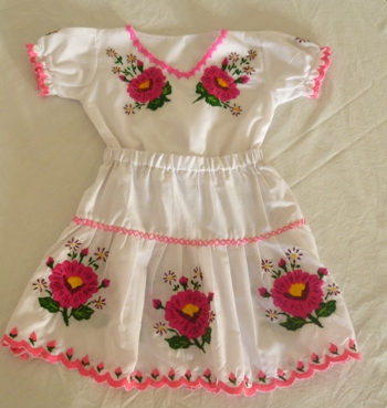 VESTIDO FEMENINO TRADICIONALRealizado en popelina de color blanco, en ocasiones en algún color pastel, el vestido femenino tradicional yaqui se caracteriza por un abundante y colorido bordado alrededor del escote del cuello, mangas y en la falda del vestido. Sus bordados son flores de varias especies entre las que sobresalen la flor de Capomo y los claveles, rodeadas de hojas con diferentes verdes. La falda del vestido bordado, va cubierta con una tela transparente, tipo organza o nylon, de diversos colores que dejan pasar veladamente el bordado de la falda. A esta parte del atuendo le llaman faldilla. Este hermoso vestido bordado se complementa con un rebozo, generalmente de colores luminosos y a juego con el color de las flores bordados, que porta con mucho garbo y gracia la mujer yaqui. También les gusta usar rebozos traídos del sur de México y conocidos como los famosos rebozos de bolita de Santa María de San Luis Potosí. Los accesorios también son muy importantes. La mujer yaqui gusta de lucir aretes de oro en forma de arracadas, collares, peinetas…etc. y huaraches de colores en sus pies. Además de este vestido que utiliza en las ceremonias y días festivos, tiene otro más sencillo, sin bordado, en colores vivos y brillantes con aplicaciones de encaje, que utiliza para la vida cotidiana que en ocasiones combinan con la blusa bordada. |