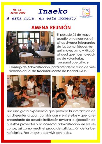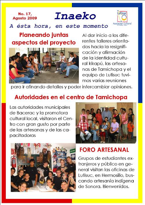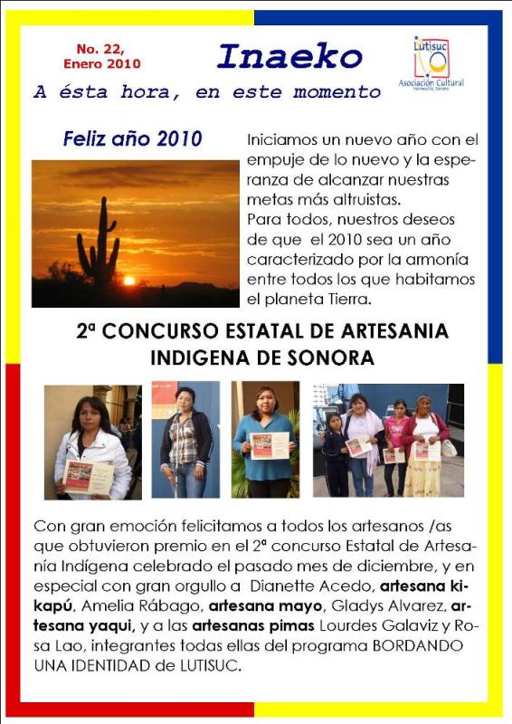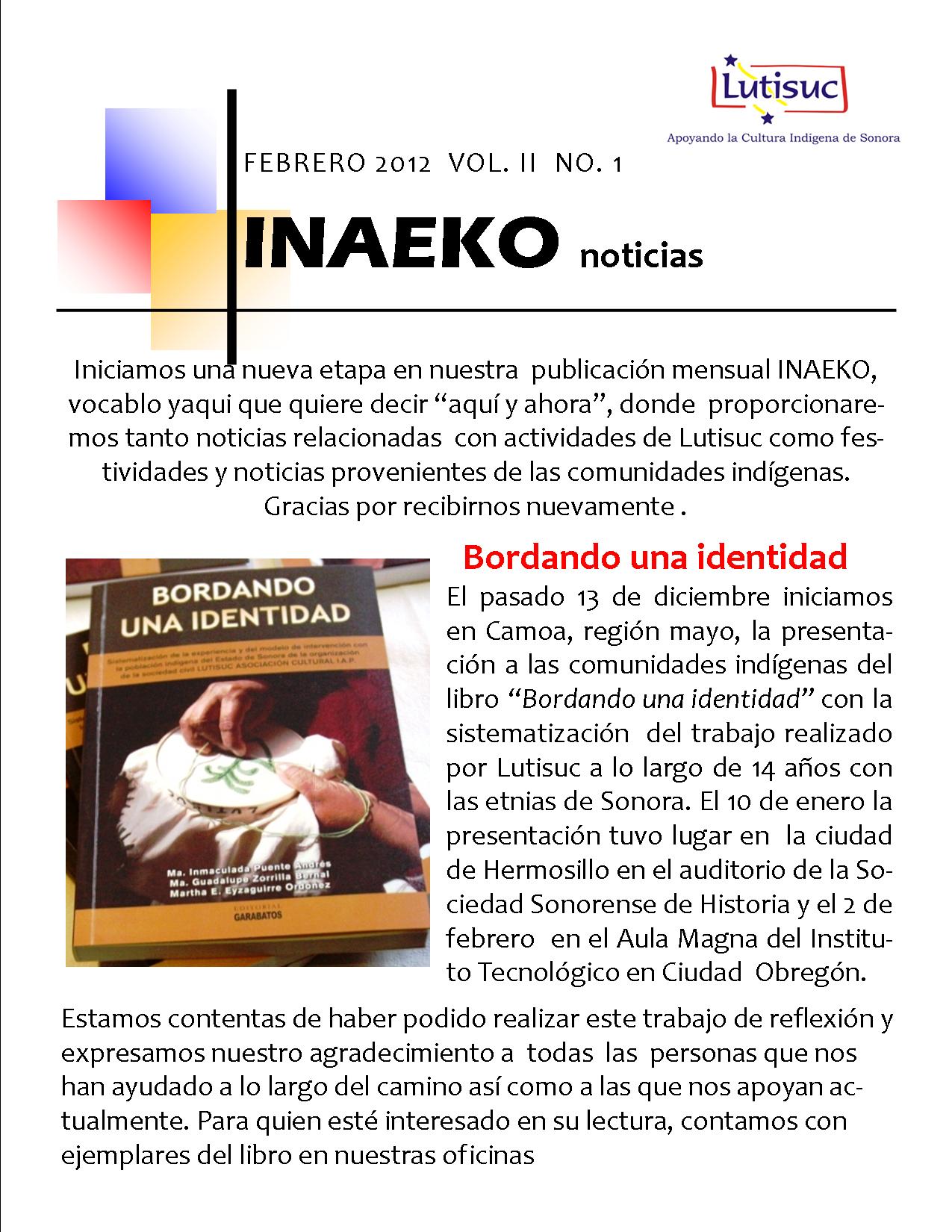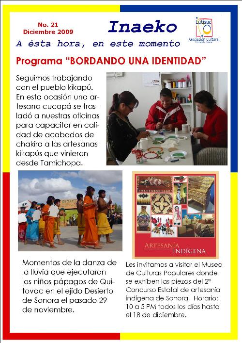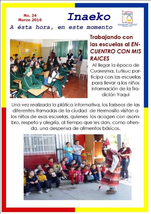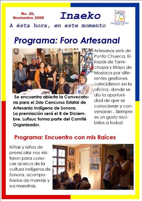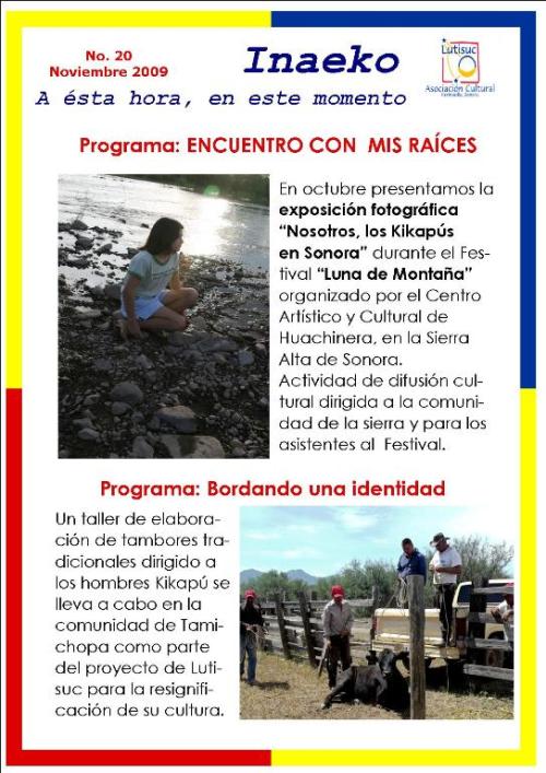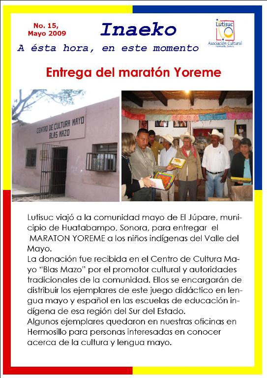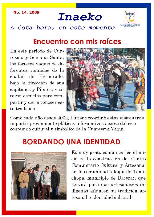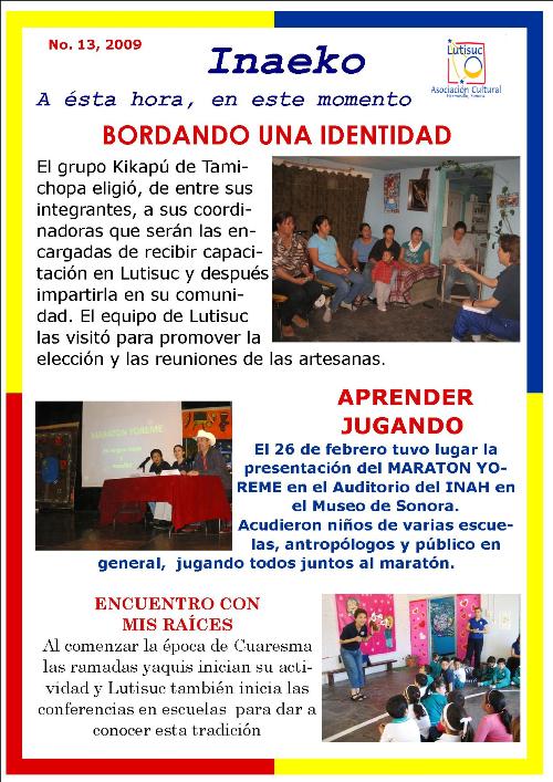 Inaeko “A ésta Hora y en este momento”Con el objeto de dar a conocer periódicamente nuestras actividades, enviamos mensualmente un pequeño boletín al que denominamos con la palabra yaqui Inaeko, que quiere decir “ a esta hora y en este momento” aludiendo a nuestro trabajo más reciente en ese momento. Estos son los boletines enviados desde el primer número en marzo de 2008. |