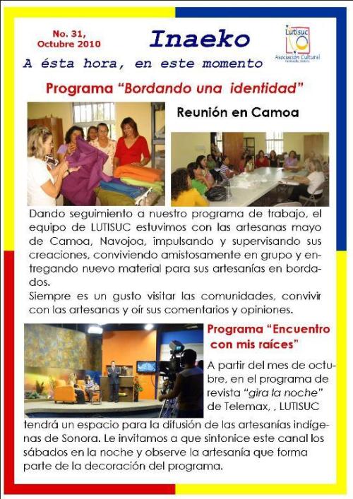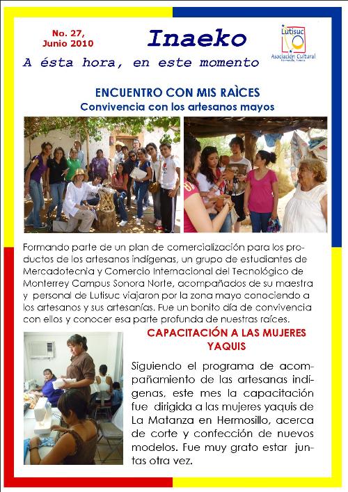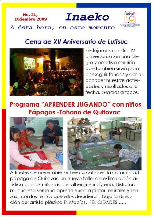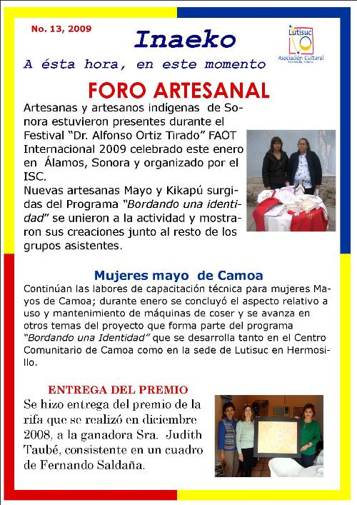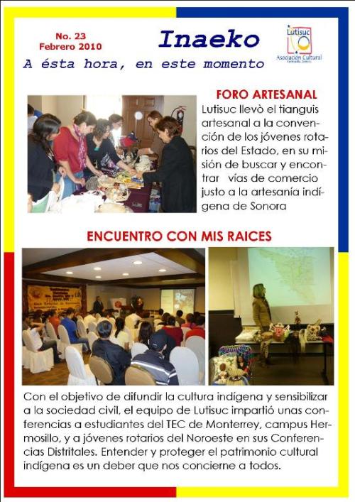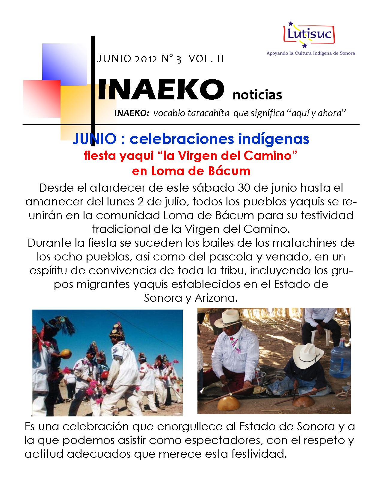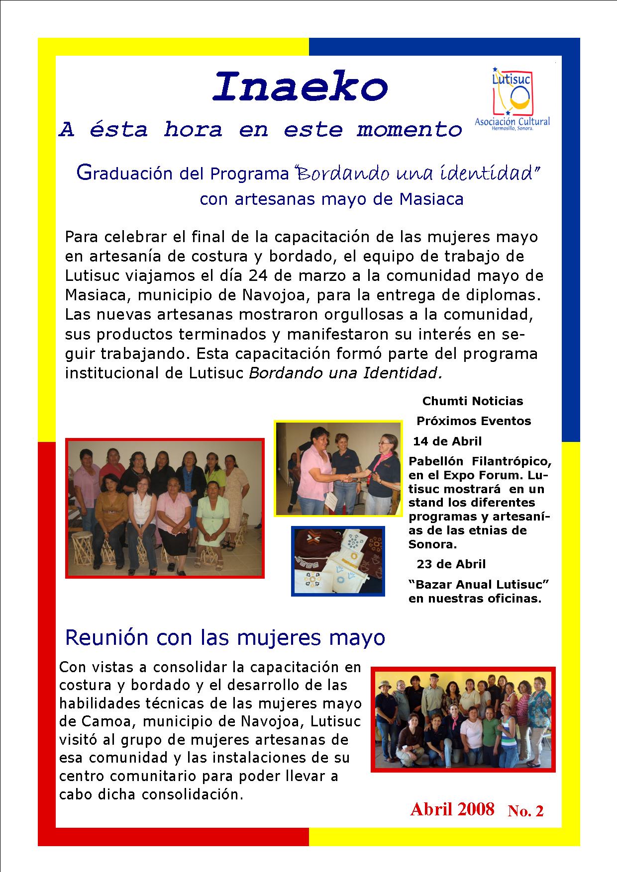Inaeko “A ésta Hora y en este momento”Con el objeto de dar a conocer periódicamente nuestras actividades, enviamos mensualmente un pequeño boletín al que denominamos con la palabra yaqui Inaeko, que quiere decir “ a esta hora y en este momento” aludiendo a nuestro trabajo más reciente en ese momento. Estos son los boletines enviados desde el primer número en marzo de 2008. |