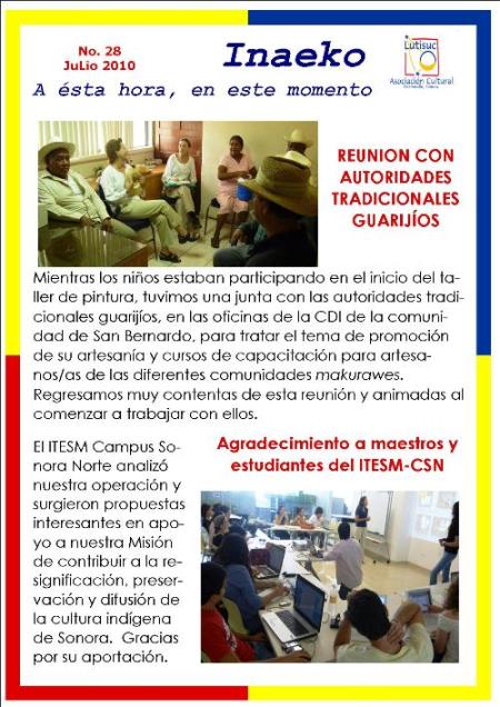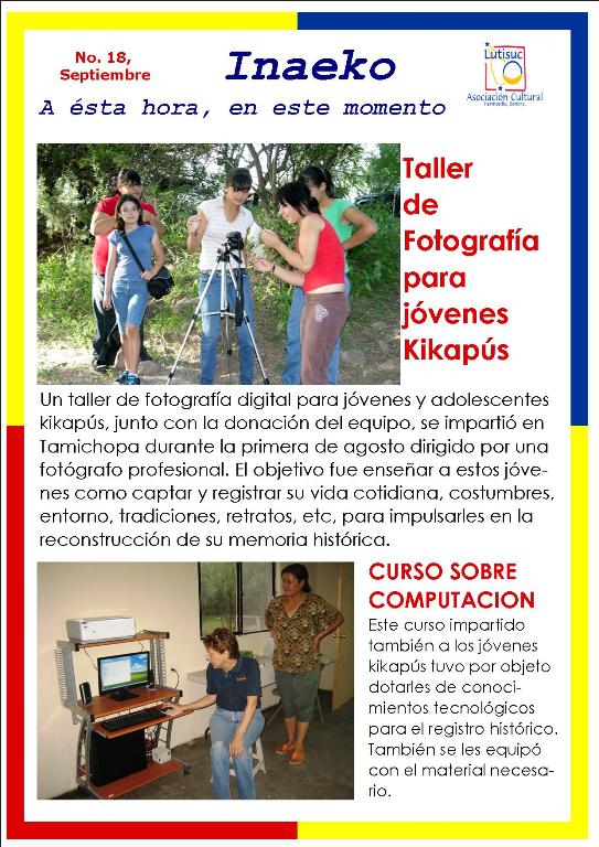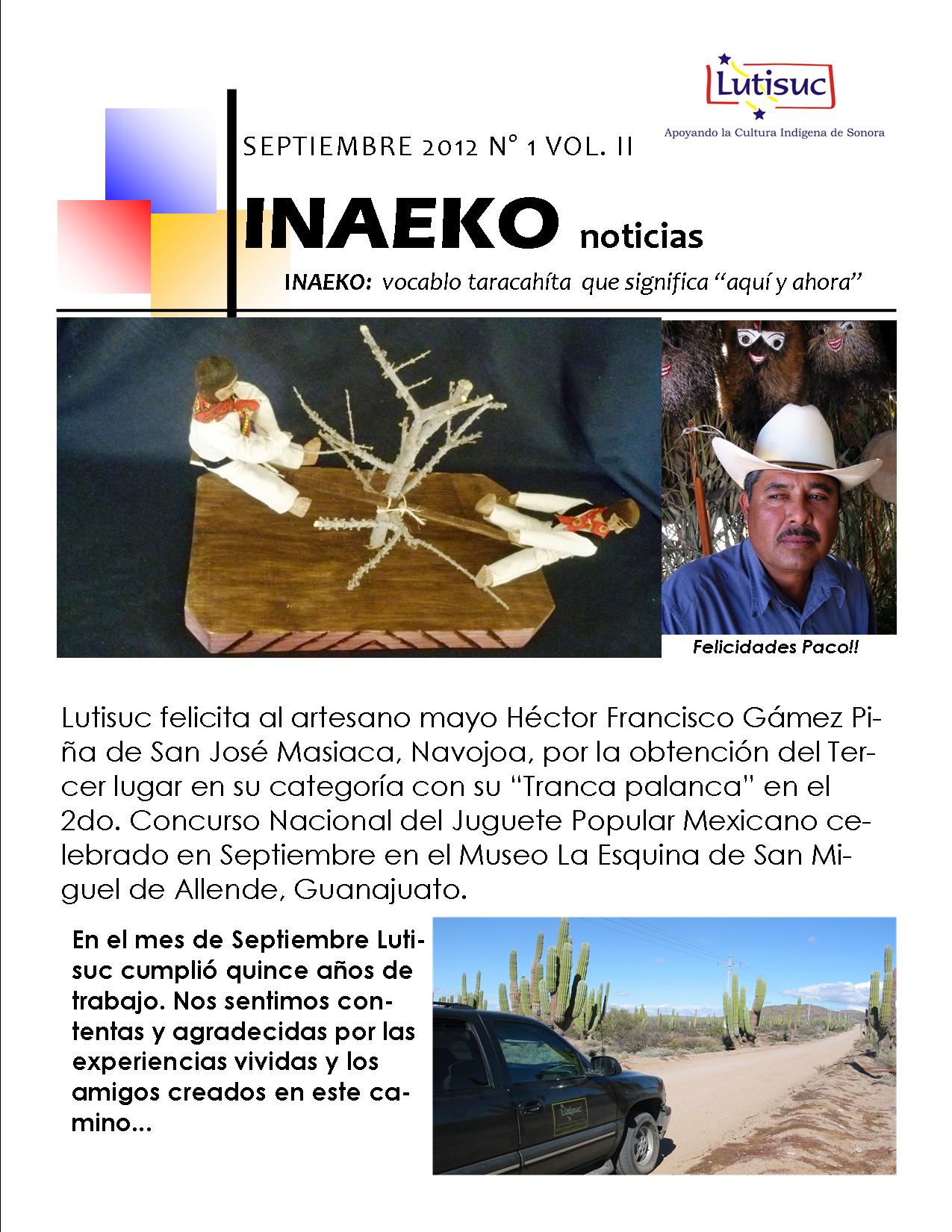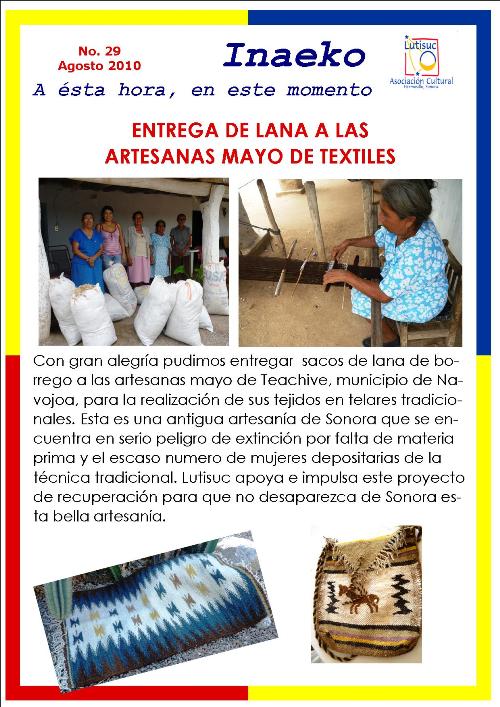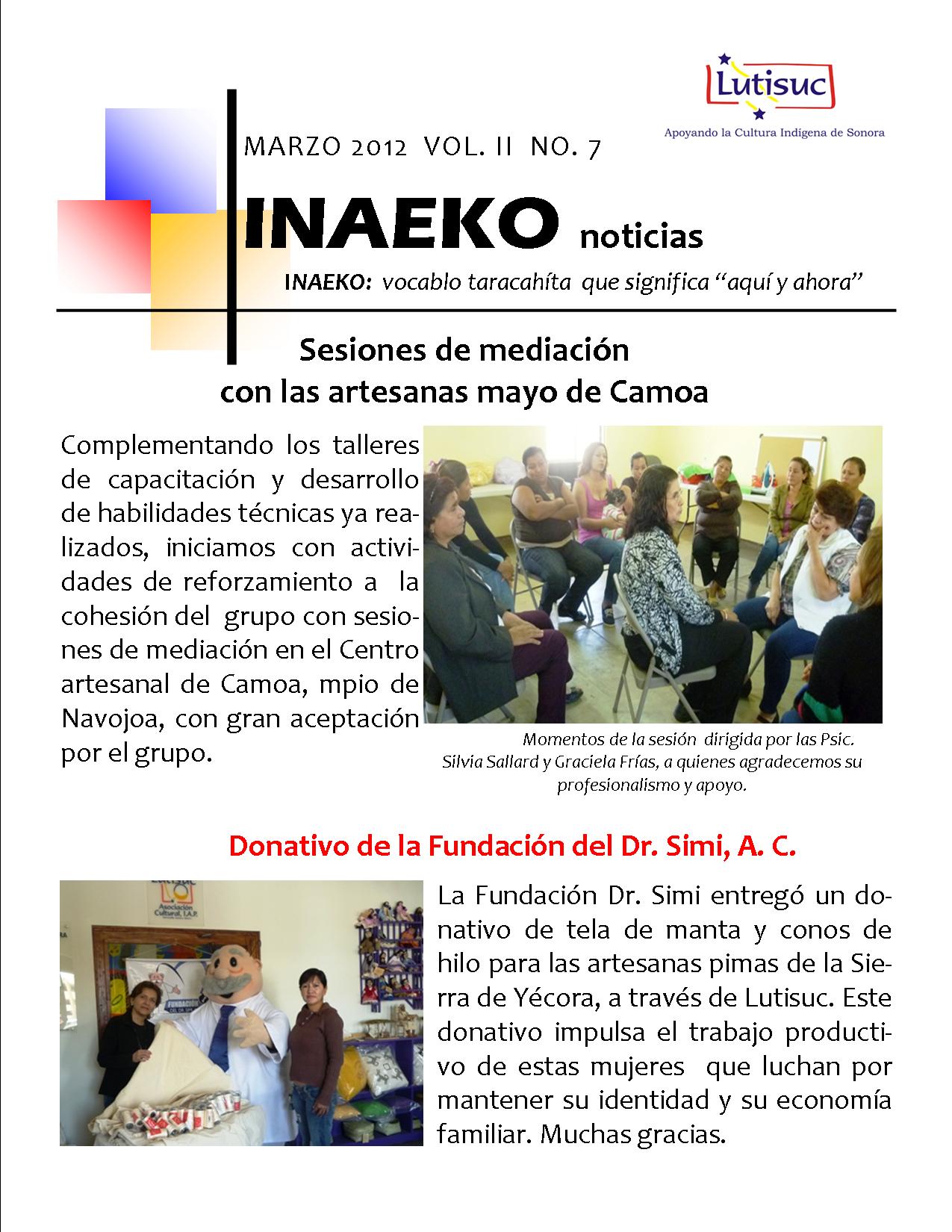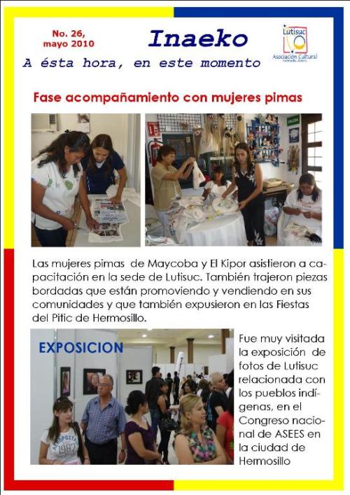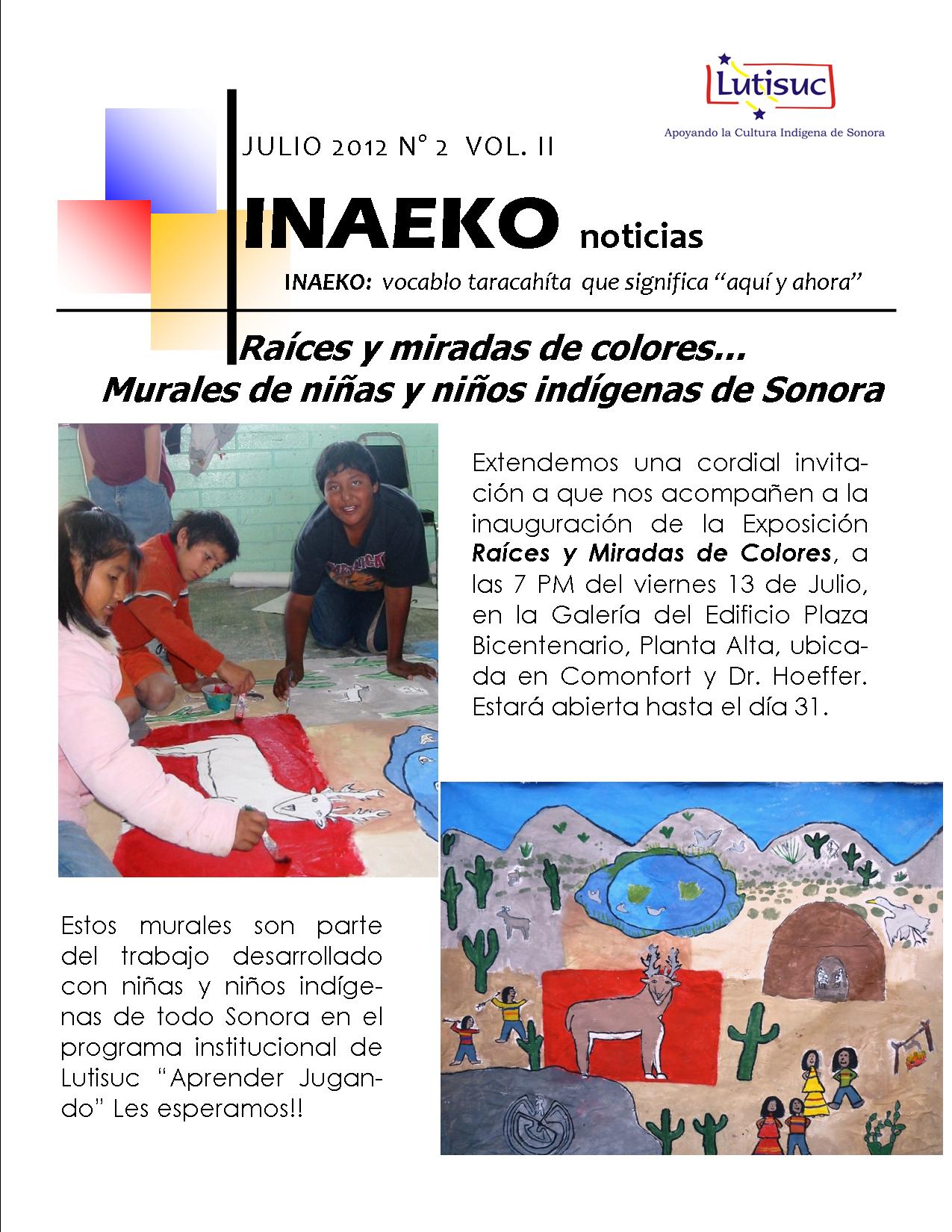 Inaeko “A ésta Hora y en este momento”Con el objeto de dar a conocer periódicamente nuestras actividades, enviamos mensualmente un pequeño boletín al que denominamos con la palabra yaqui Inaeko, que quiere decir “ a esta hora y en este momento” aludiendo a nuestro trabajo más reciente en ese momento. Estos son los boletines enviados desde el primer número en marzo de 2008. |