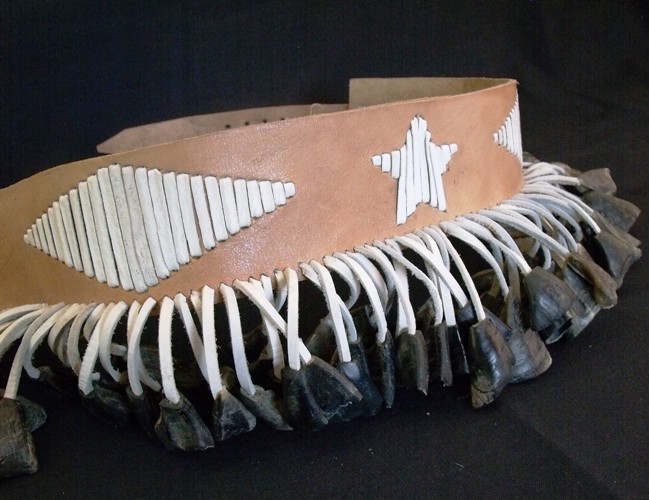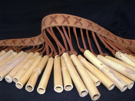 CINTURON TRADICIONAL DE FARISEOEn el fariseo yaqui o chapayeca el cinturón tradicional está elaborado con una tira de unos 10 cms. de alto de cuero vacuno y pezuñas de cerdo, que cuelgan de pequeñas tiras de piel de unos 7 cms. En cambio, en el fariseo mayo los colgantes son pequeños carrizos, de unos 25 cms. de alto, que cuelgan de la tira de cuero amarrada a la cintura. En algunas comunidades mayo el carrizo que cuelga del cinturón de chapayeca se sustituye por casquillos de bala. Ambos cinturones se atan con hebilla de metal y los fariseos, al mover las caderas, lo utilizan como un lenguaje para dar las gracias o para unirse a las alabanzas generales en las diferentes ceremonias de Cuaresma y Semana Santa. |