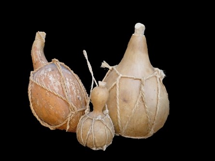 GUAJES O BULESOtro objeto de interés artesanal lo constituyen los guajes, también conocidos como tecomates o bules. Los grupos que más los utilizan son los mayos (yoreme), los yaqui (yoeme) y los guarijío (makurawe). El bule o guaje es una planta mexicana similar a la calabaza que una vez seca y hueca es usada para transportar líquidos. Yaquis y mayos los utilizan como materia prima base para la elaboración de sonajas de danzantes o bien para las huejas que son base de los rascadores y el tambor de agua para la danza. Los mayos y guarijíos tejen con mecate una especie de bolsa o red a su alrededor, para cargarlo o bien colgarlo en algún lugar de la pared o de la ramada. En su parte más estrecha, el cuello, abren un orificio para poder tomar el líquido y lo tapan con un pedazo de olote (tronco desgranado de la mazorca del maíz ya seco). |