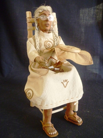 La mujer artesana sentada en su silla esta hecha en madera de chino, también presenta pelo y pestañas injertadas, lentes de acrílico y brazos y piernas articuladas. La silla en sí es una pieza valiosa por el detalle de su ejecución y la perfección de su acabado, está trabajada en madera de guásima y tiras de cuero crudo.